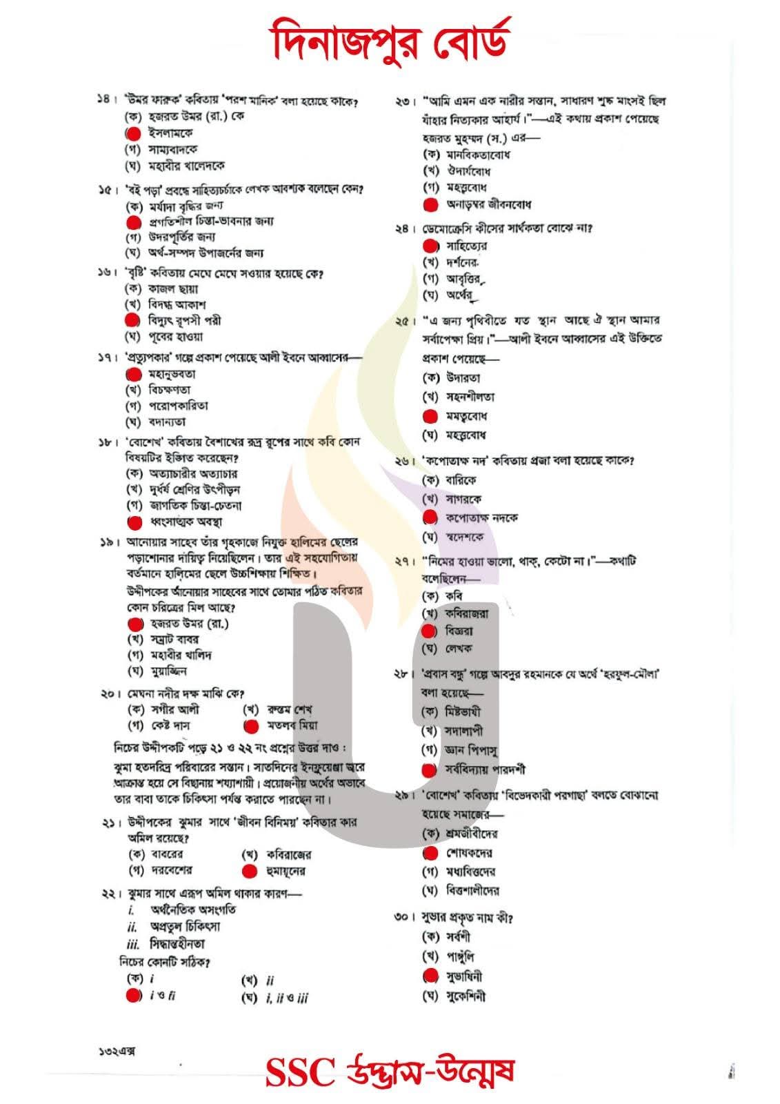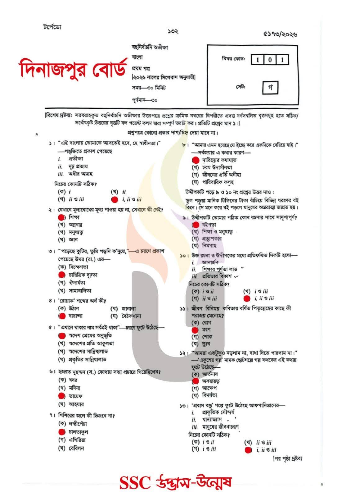 এসএসসি দিনাজপুর বোর্ড বাংলা ১ম পত্র বহুনির্বাচনি/MCQ সমাধান ২০২৬