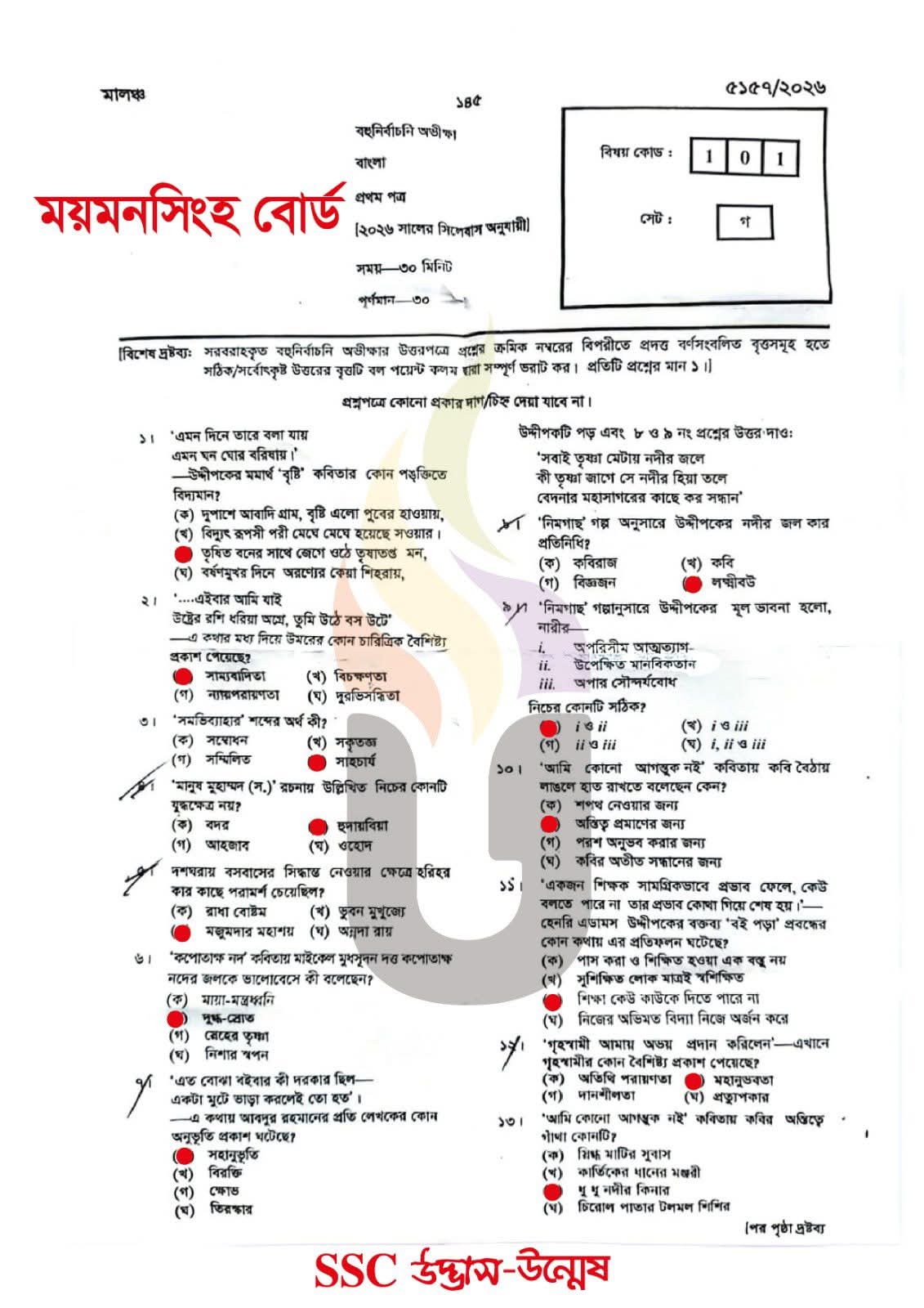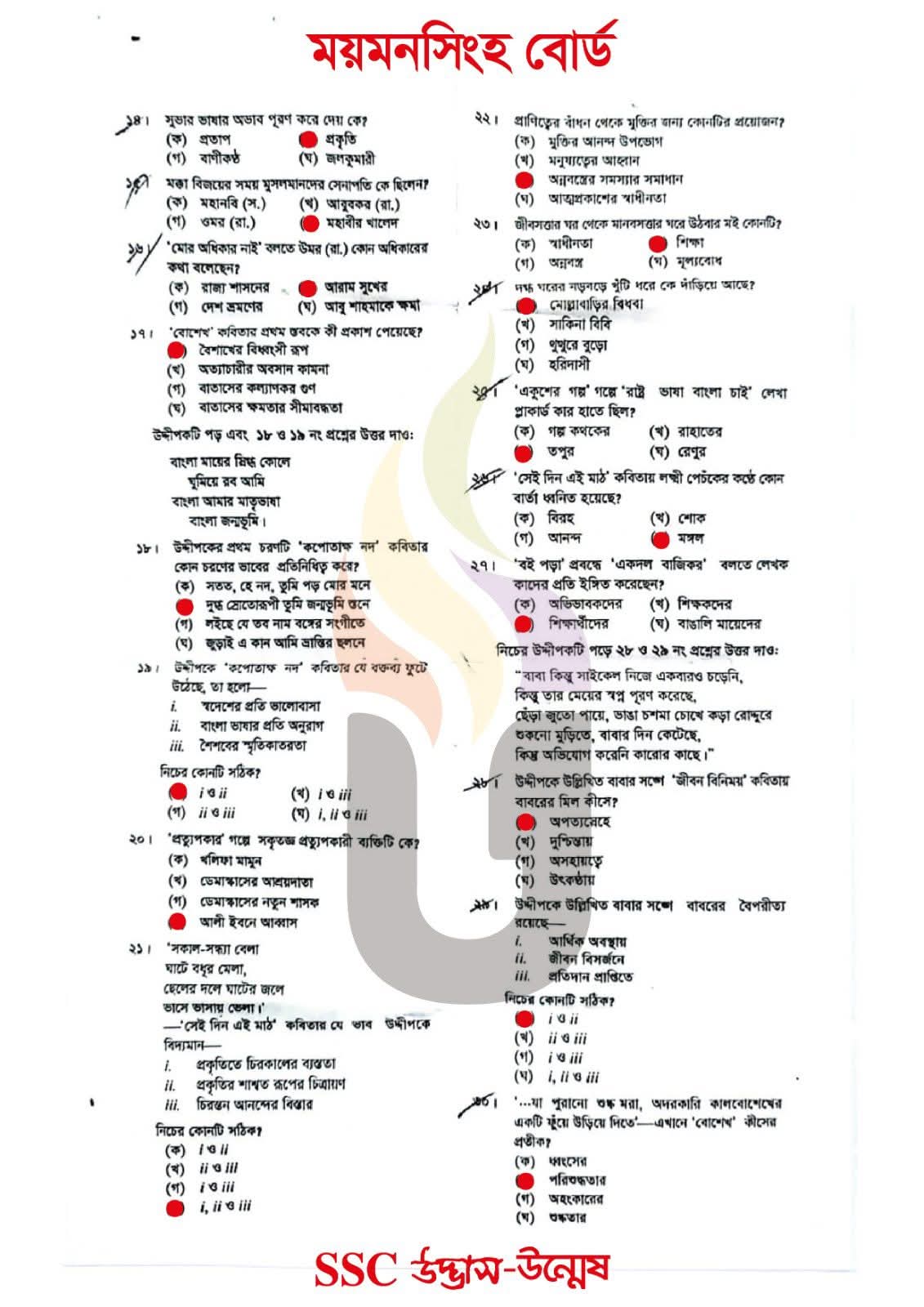 এসএসসি ময়মনসিংহ বোর্ড বাংলা ১ম পত্র বহুনির্বাচনি/MCQ সমাধান ২০২৬