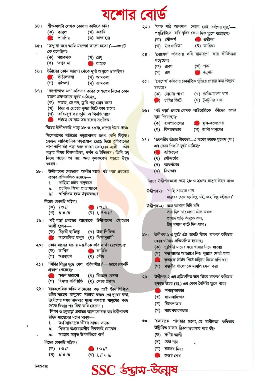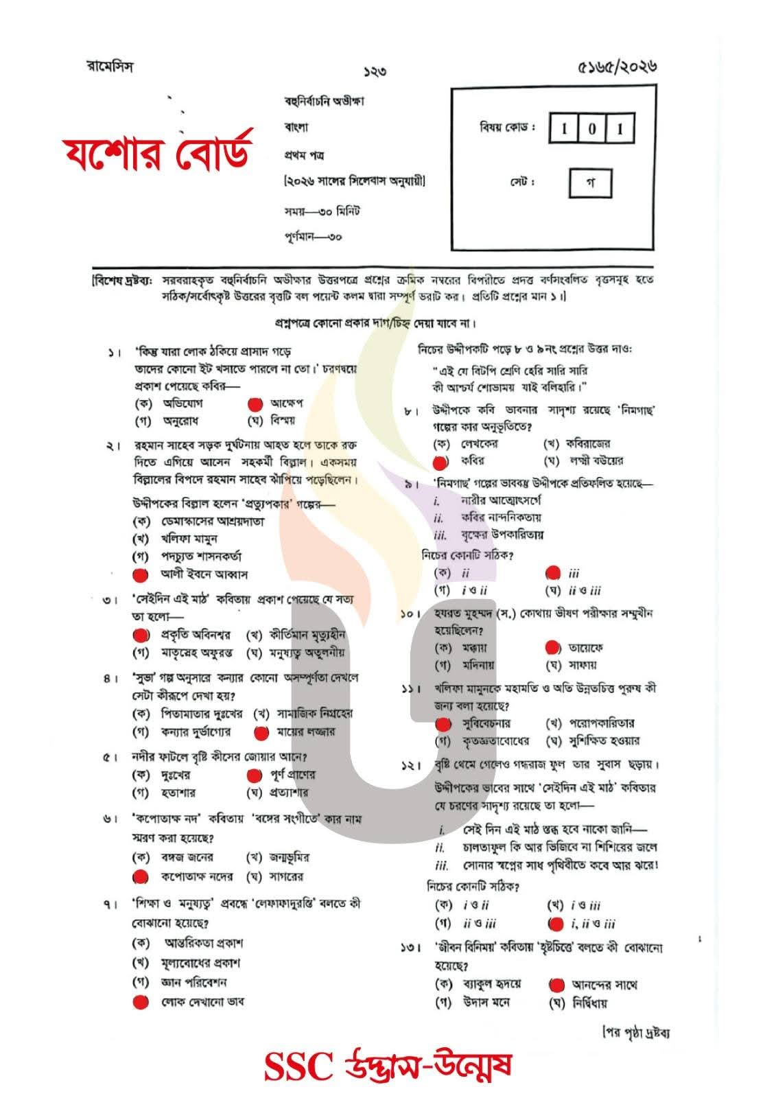এসএসসি যশোর বোর্ড বাংলা ১ম পত্র বহুনির্বাচনি/MCQ সমাধান ২০২৬