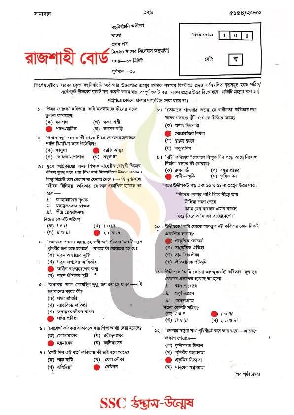এসএসসি রাজশাহী বোর্ড বাংলা ১ম পত্র বহুনির্বাচনি/MCQ সমাধান ২০২৬