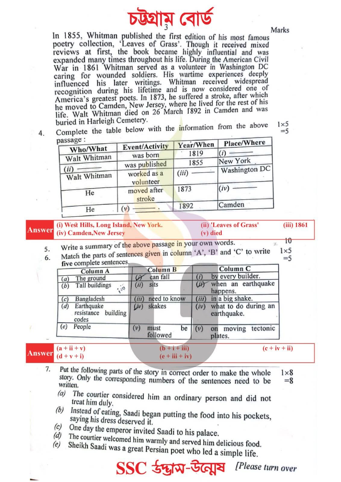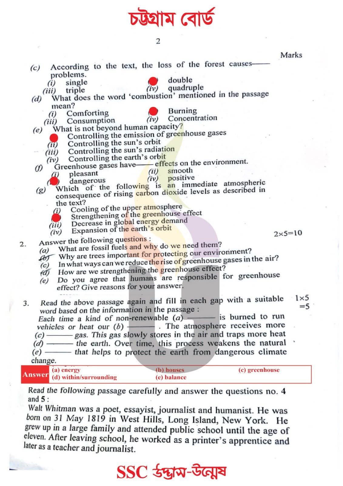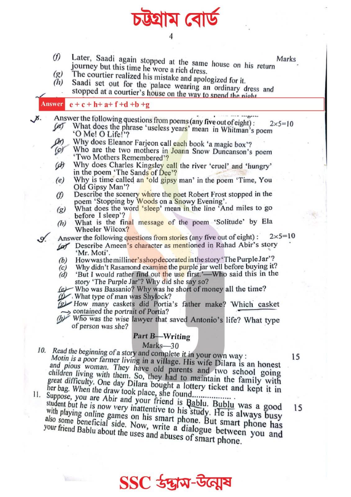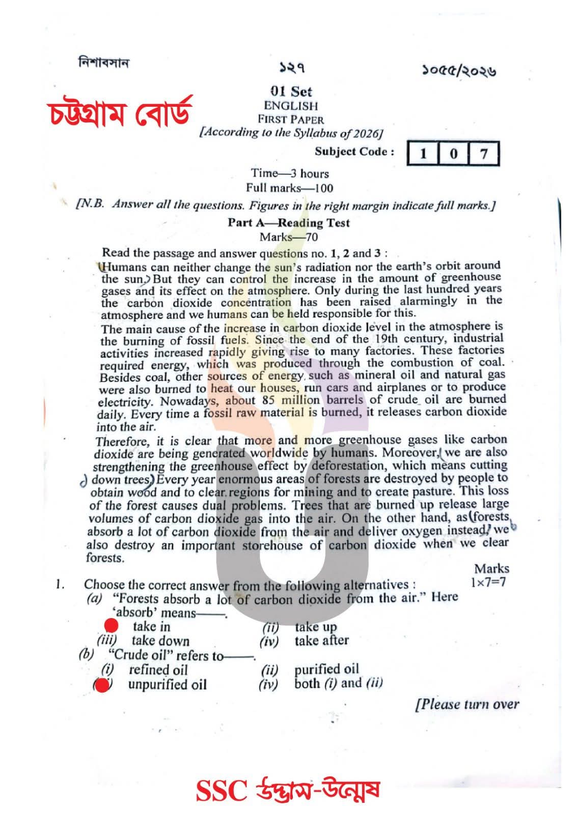 এসএসসি চট্রগ্রাম বোর্ড ইংরেজি ১ম পত্র প্রশ্ন সমাধান ২০২৬