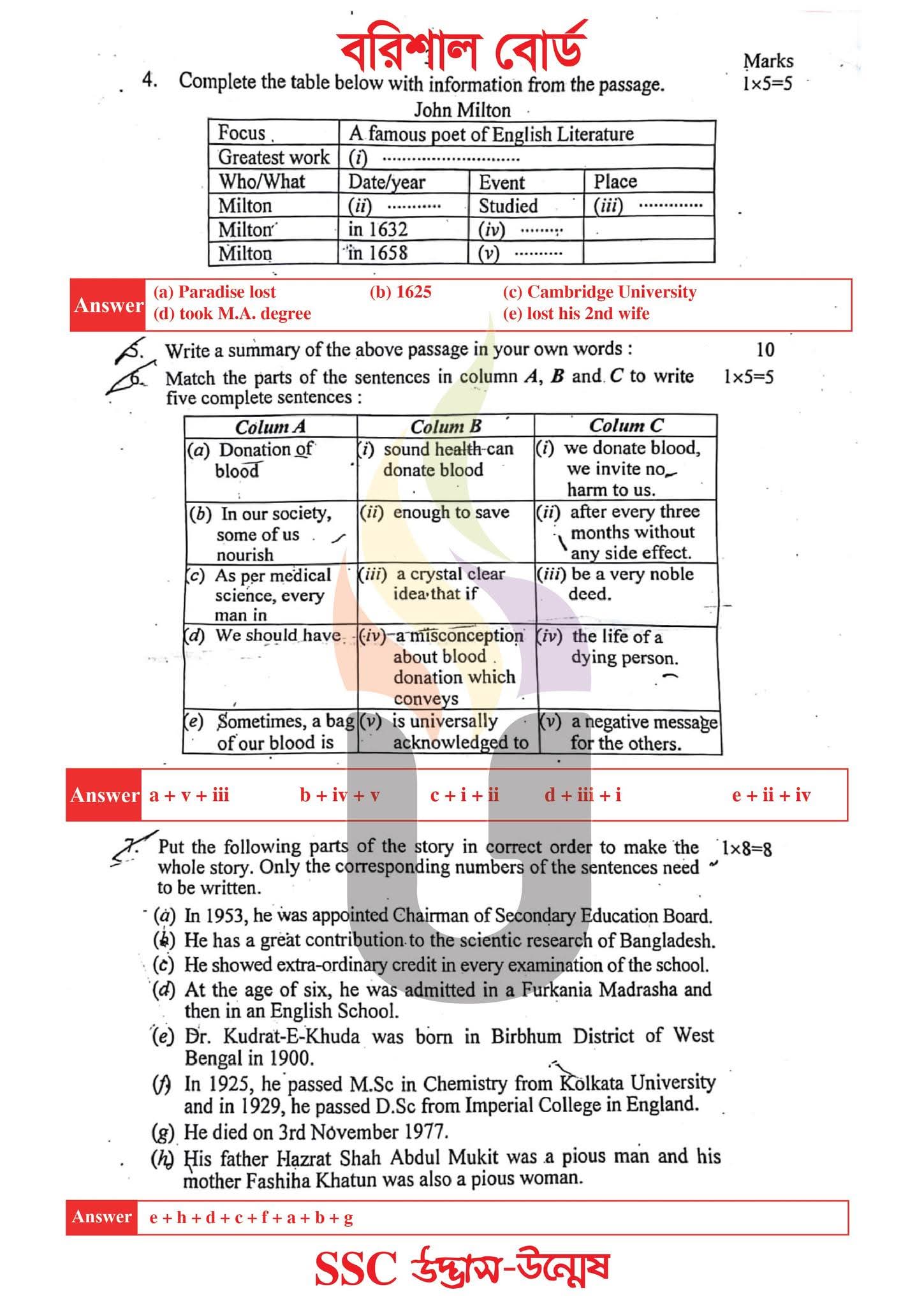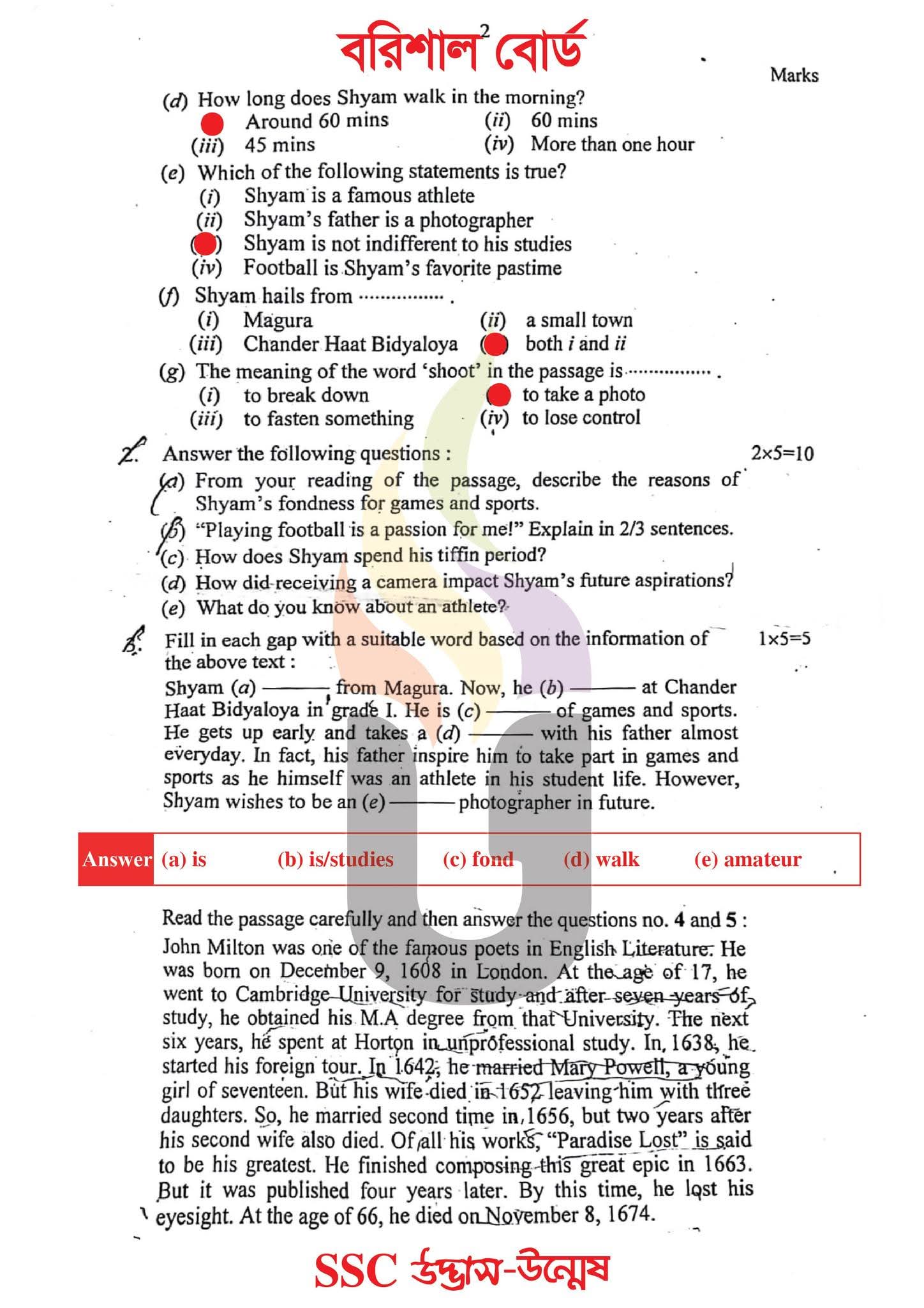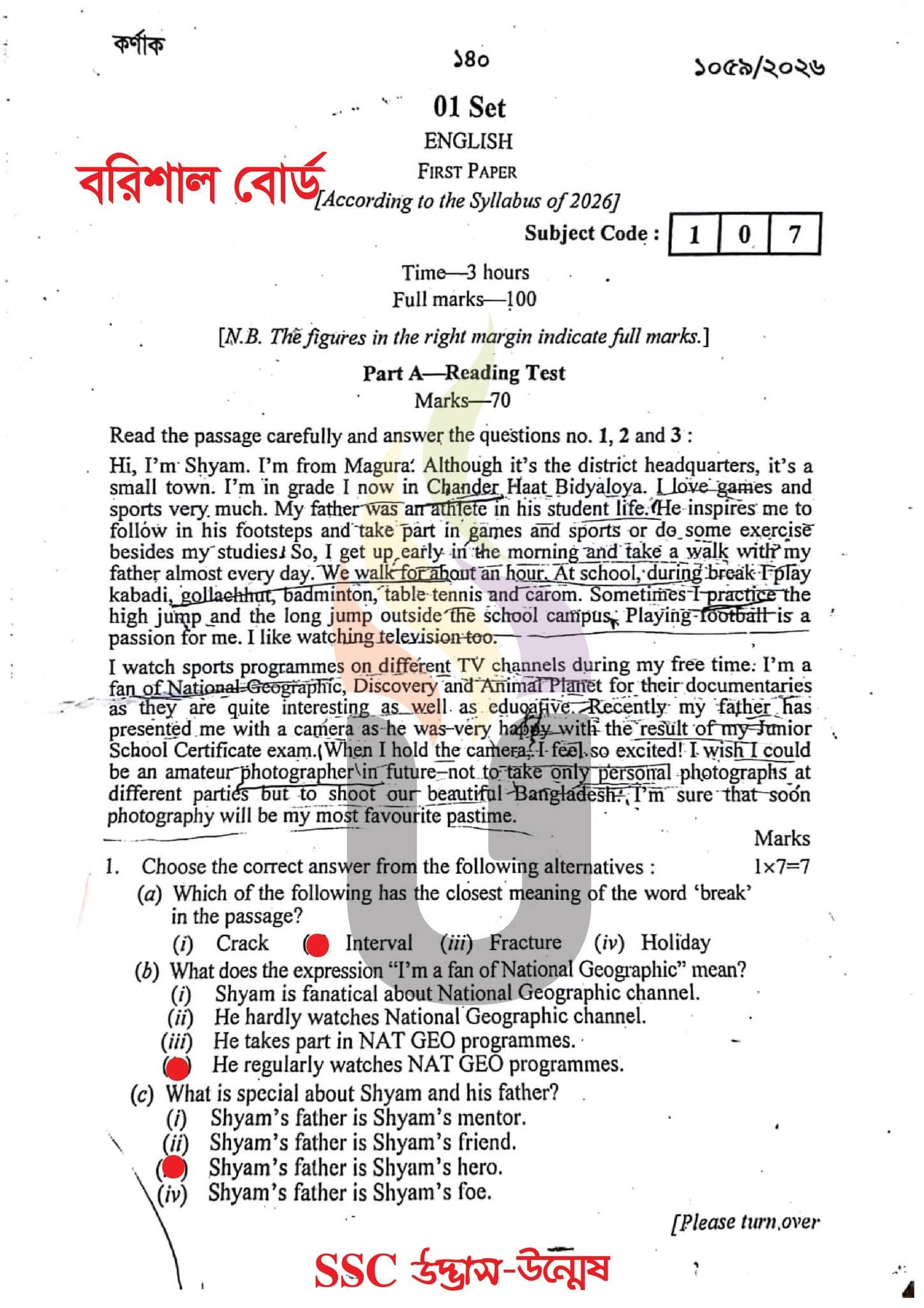 এসএসসি বরিশাল বোর্ড ইংরেজি ১ম পত্র প্রশ্ন সমাধান ২০২৬