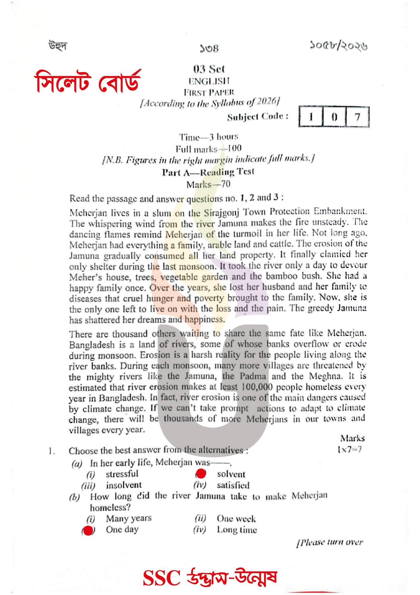 এসএসসি সিলেট বোর্ড ইংরেজি ১ম পত্র প্রশ্ন সমাধান ২০২৬